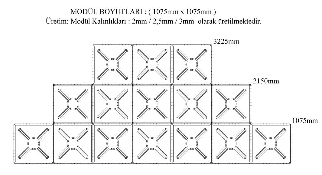 Yükseklik maksimum 3225 mm olarak uygulanabilir; fakat en ve boy ölçüleri istenildiği kadar arttırılabilir.